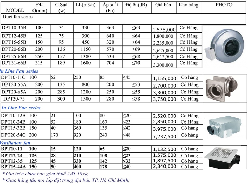 BẢNG BÁO GIÁ QUẠT THÔNG GIÓ